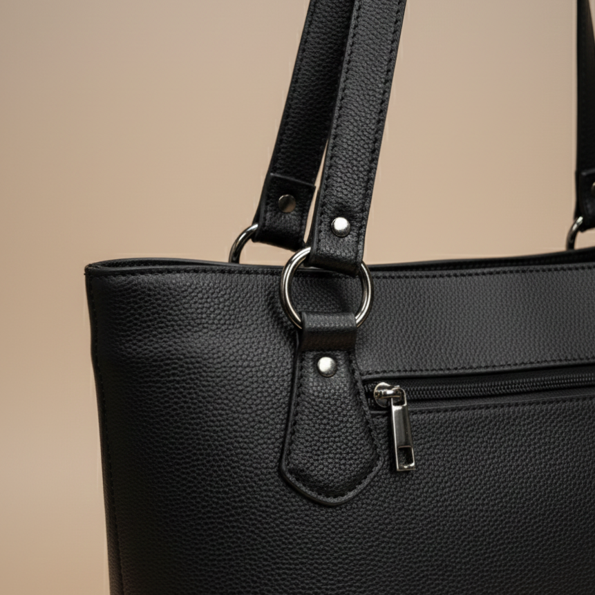 With its bold black finish and timeless detailing, the Carryall Tote is the perfect balance of